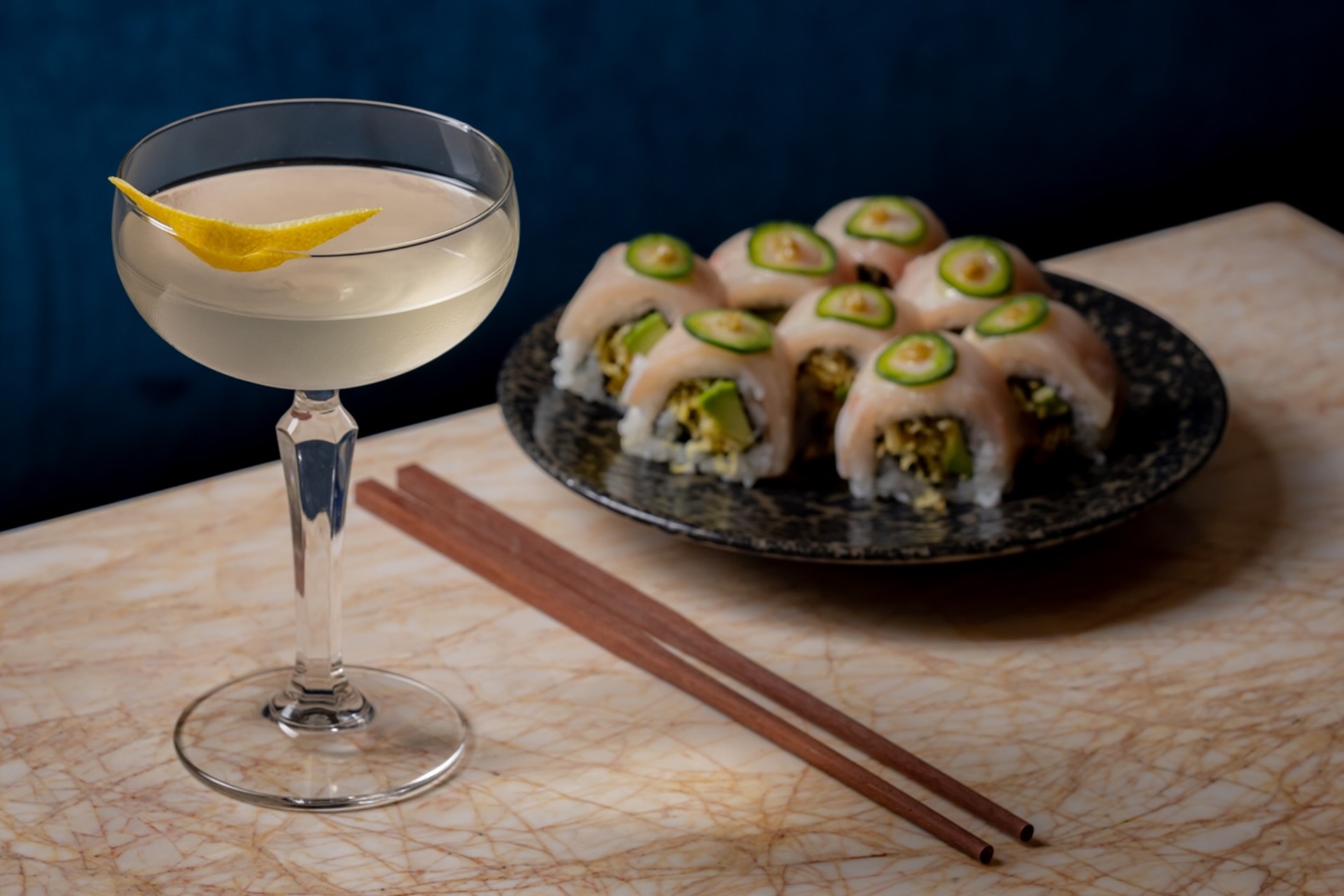 Behind its striking deep-blue façade, the restaurant spans two floors with a marble-accented dining room and counter seating overlooking the action. Below, an atmospheric subterranean lounge designed by Dion et Arles draws on the spirit of Saint-Germain’s classic bar à vins, with bold geometric carpeting and intimate seating — a natural setting for pre-dinner drinks, late suppers and nightcaps.