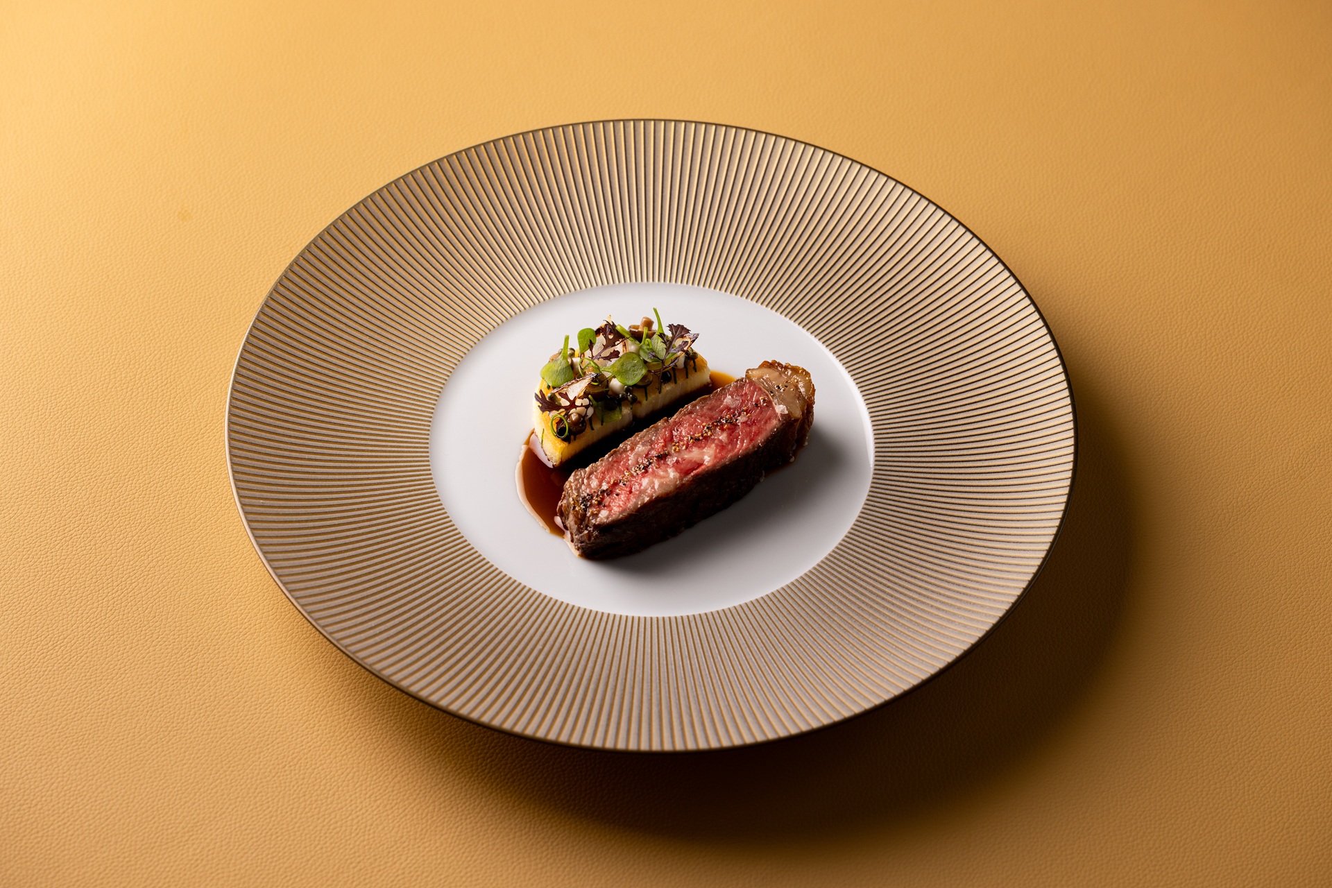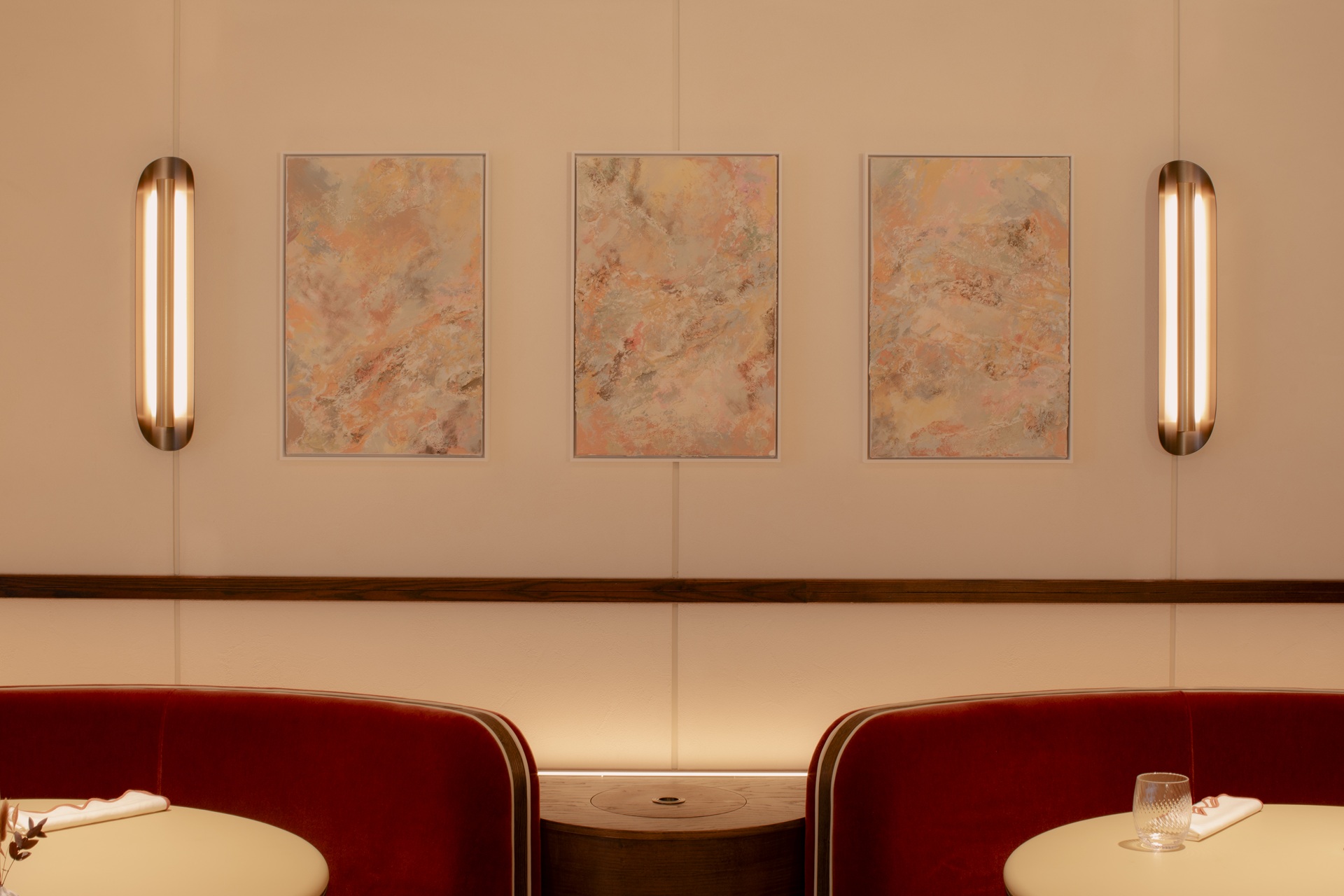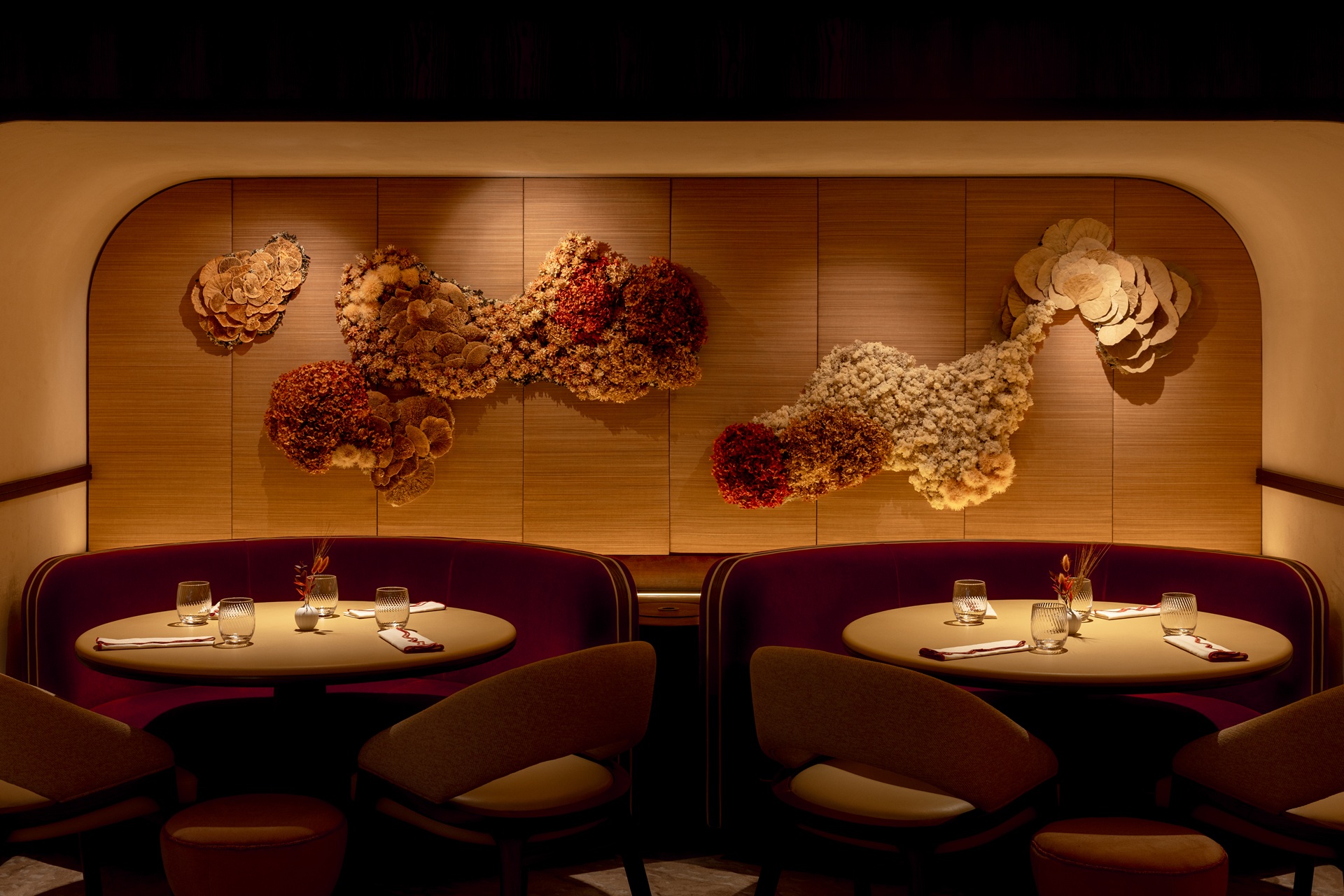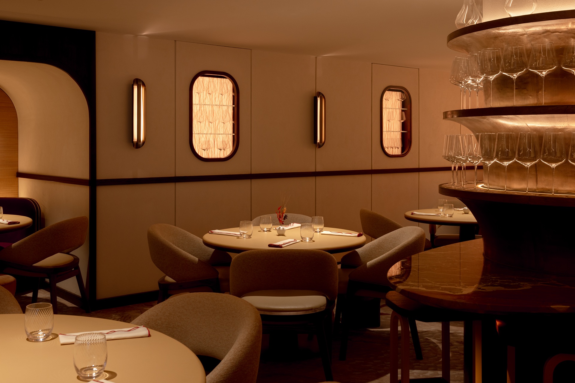 Designed by Russell Sage Studio, the interiors are intentionally understated yet richly tactile. A softly layered palette, sculptural detailing and considered lighting create a dining room that feels contemporary without chasing fashion — warm, confident and quietly luxurious.