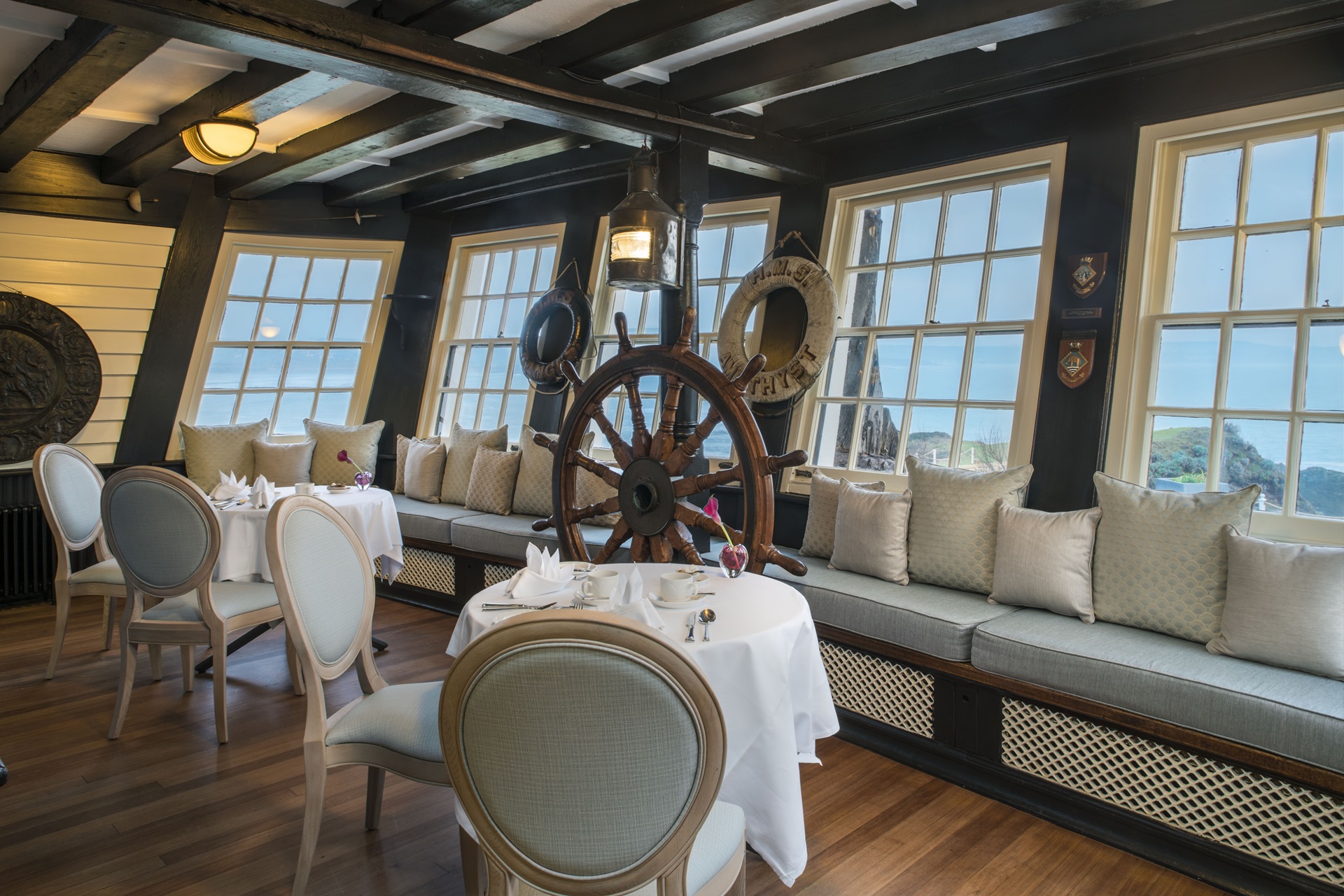 Unwind at Burgh Island - the iconic Art Deco island hotel, renowned for its celebrated restaurants. The South Devon retreat famously inspired Agatha Christie's captivating stories, captivating stories, weaving its way into folklore as the backdrop of some of her most thrilling plots. The landmark on its own tidal island and surrounded by golden beaches and silver seas, is a magnificent example of the architecture of the day with the added quirk of the poop deck from the HMS Ganges (1821), the Royal Navy's last fighting sailing ship incorporated into the restaurant when it was scrapped in 1929.