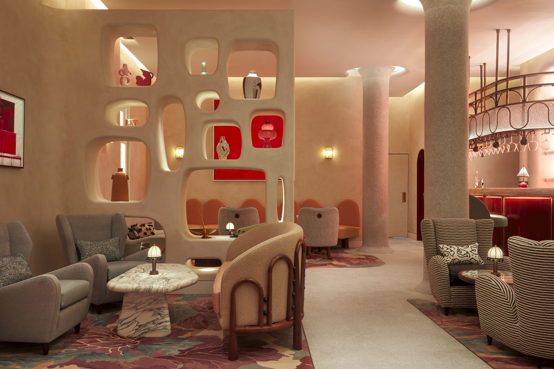 The striking interior is the work of Bryan O’Sullivan, whose soft-hued palette allows the art to sing. Follow the mosaic runway, hand-cut and laid by Italian craftsmen, to the dazzling pink onyx bar, or to admire the red-flecked marble fireplace, where ‘I Am Rouge’ by Louise Bourgeois presides. Bourgeois’ centrepiece is joined by works in crimson and scarlet from Jenny Holzer, Ti-a Thuy Nguyen and a single photographic piece by Trina McKillen. Flanking the fireplace are two striking, vast glass panels in vivid reds and blues by celebrated British artist Brian Clarke – the only male exhibited in the Red Room.