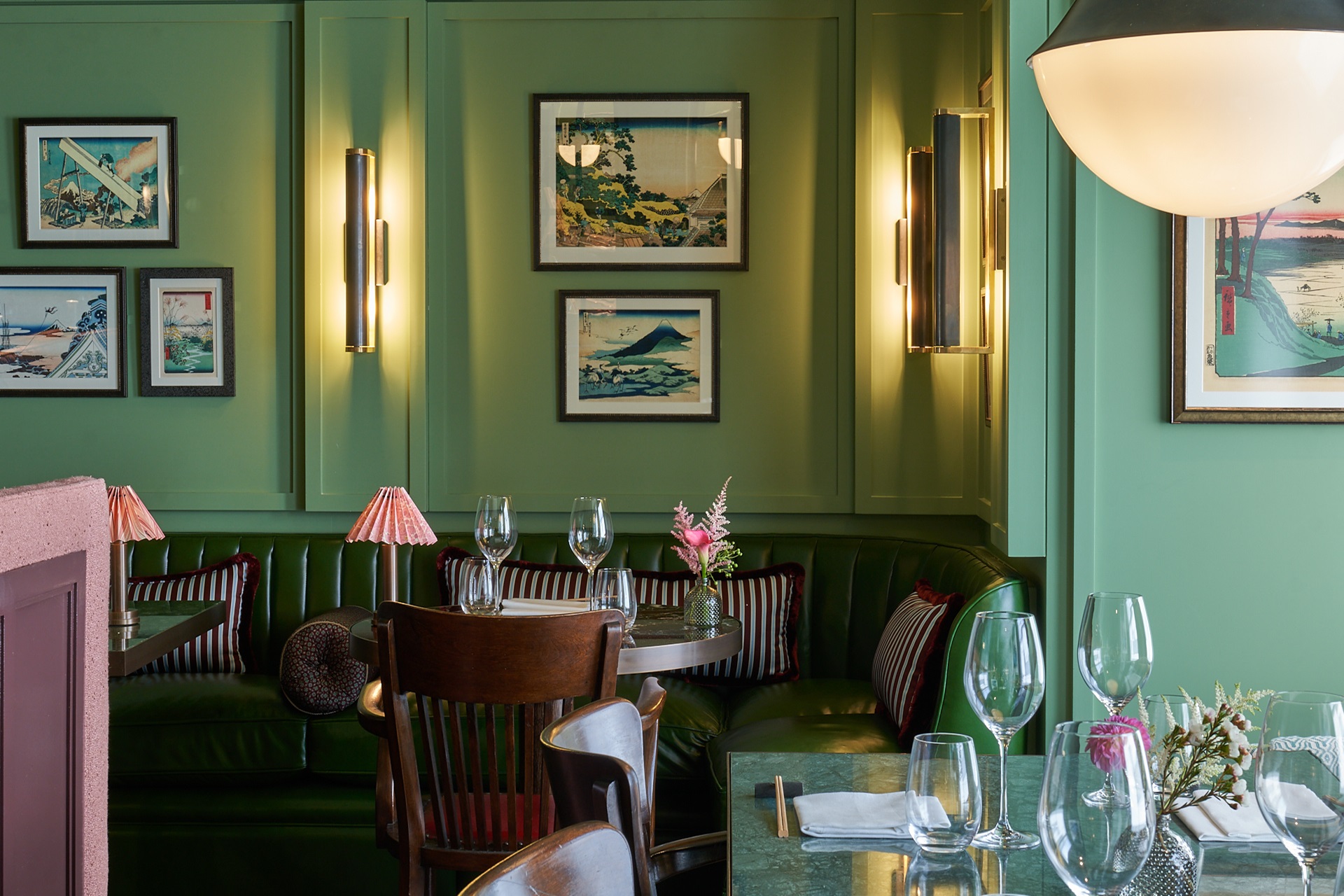 The dining room, decorated in gentle hues of green, is enhanced by an exquisite collection of 19th-century woodblock prints showcasing the globally renowned Thirty-Six Views of Mount Fuji.